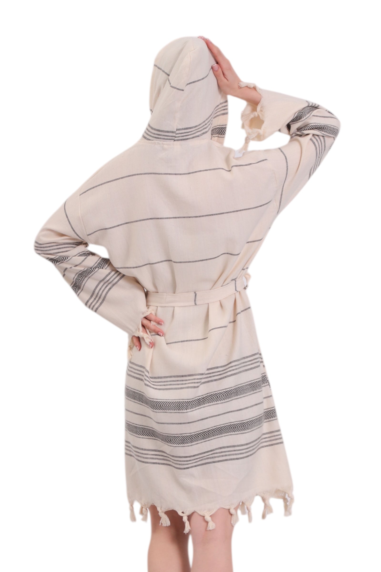 Bu bornoz, geleneksel Türk hamamı bornozunun sıcaklığını ve kalitesini, günümüzün estetik ve konfor beklentileriyle buluşturur. Sadece bir tekstil ürünü değil; aynı zamanda sağlıklı yaşamınıza ve stilinize zarif bir katkıdır.